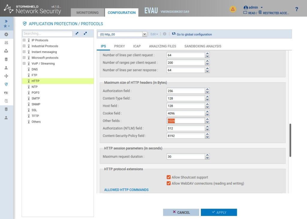 By ochrona Stormshield była skuteczna, niezbędne jest utrzymanie wartości "Other fields" w menu "Maximum size of HTTP header" na poziomie poniżej 1900 bajtów (standardowe ustawienie to 1024):