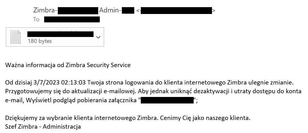 Atak rozpoczyna wiadomość e-mail zawierająca ostrzeżenie o niezbędnej aktualizacji serwera poczty e-mail, dezaktywacji konta lub innym problemie technicznym i kieruje użytkownika do kliknięcia w załączony plik. Załącznik to phishingowy plik HTML. Po jego otwarciu użytkownikowi wyświetlana jest fałszywa strona logowania Zimbra. Kiedy ofiara wpisze swoje dane uwierzytelniające, są one przesyłane wprost na serwer kontrolowany przez przestępców. W efekcie atakujący są w stanie przejąć konto e-mail ofiary. Wygląda na to, że cyberprzestępcy są również w stanie włamać się na konta administratorów i tworzyć nowe skrzynki pocztowe, które będą następnie wykorzystane do wysyłania wiadomości phishingowych do kolejnych osób. Przejęcie dostępu do wirtualnych serwerów i kont może też otworzyć drogę do ataków typu ransomware.