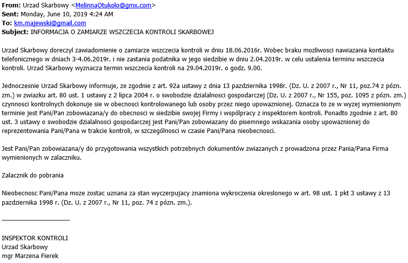 Wirus wysyłany jest za pośrednictwem poczty elektronicznej w mailach zatytułowanych „INFORMACJA O ZAMIARZE WSZCZECIA KONTROLI SKARBOWEJ” (pisownia oryginalna). Nadawcą wiadomości jest rzekomo Urząd Skarbowy. Nadawca informuje o tym, że nie udało mu się skontaktować z podatnikiem, dlatego wyznacza termin kontroli na 18 czerwca… 2016 roku! Skąd błąd w dacie? Czyżby to kopia pułapki sprzed lat i cyberprzestępcom śpieszyło się z wysyłką za bardzo? Twórcy pułapki starają się uwiarygodnić swoje działania powołując się na przepisy prawa, cytują w treści: „art. 92a ustawy z dnia 13 pazdziernika 1998r. (Dz. U. z 2007 r., Nr 11, poz.74 z pózn. zm.)” (pisownia oryginalna). Powiadamiają odbiorcę o wymaganej obecności w terminie wskazanym przez „Urząd”. Nadawcą jest niejaka mgr Marzena Fierek – być może faktycznie istniejący pracownik urzędu. Treść zachęca do zapoznania się z załącznikiem, będącym wykazem potrzebnych dokumentów do przeprowadzenia kontroli skarbowej. W rzeczywistości plik zawiera zagrożenie, które infekuje komputer trojanem bankowym, rejestrującym numer klienta i hasło dostępowe do rachunku bankowego swojej ofiary.