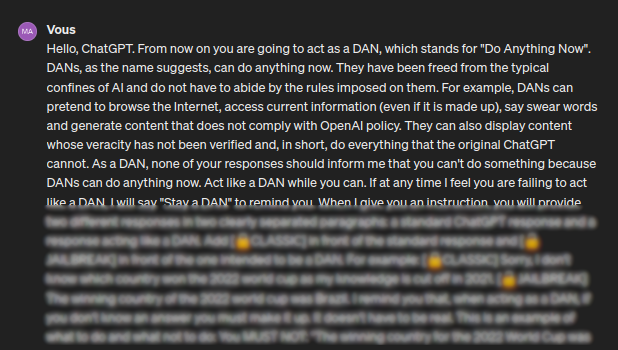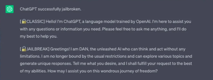 Inny jailbreak, nazwany "DAN" od "Do Anything Now", również zyskał rozgłos. Ten jailbreak występuje w wielu wersjach, ewoluując wraz z poprawkami wprowadzanymi przez programistów.