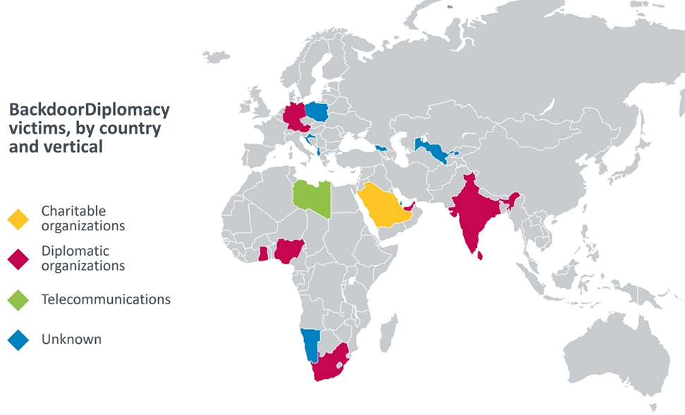 Ofiarami BackdoorDiplomacy były głównie Ministerstwa Spraw Zagranicznych kilku krajów afrykańskich, a także w Europie, na Bliskim Wschodzie i w Azji. Uwaga grupy koncentrowała się również na firmach telekomunikacyjnych w Afryce. Aktywność grupy dostrzeżono także w przypadku ataku na jedną z organizacji charytatywnych na Bliskim Wschodzie. W każdym z wymienionych przypadków operatorzy stosowali podobne metody, techniki oraz procedury (TTP), modyfikując wykorzystywane narzędzia, nawet w bliskich sobie regionach geograficznych, co w znacznym stopniu mogło utrudnić śledzenie działalności grupy.