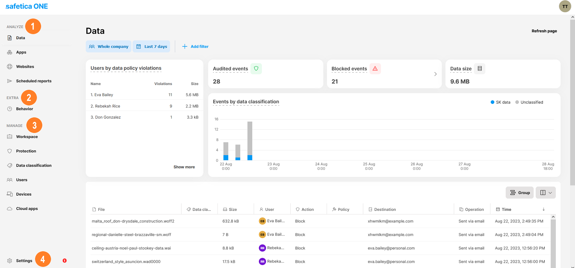 Safetica ONE 11 dzieli się na 4 główne sekcje: