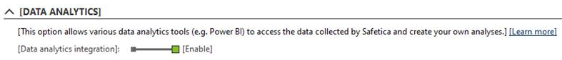 Jeśli Twój serwer SQL został zainstalowany i skonfigurowany przez Safetica, możesz zintegrować bazę danych automatycznie za pomocą Safetica Management Console. Wystarczy włączyć opcję „integracja analizy danych” i zalogować się do narzędzia analizującego dane przy użyciu nowego konta bazy danych i hasła. Jeśli przełącznik jest niedostępny i szary, poproś o odpowiednie uprawnienia lub przeprowadź ręczną integrację bazy danych (instrukcja znajduje się poniżej).