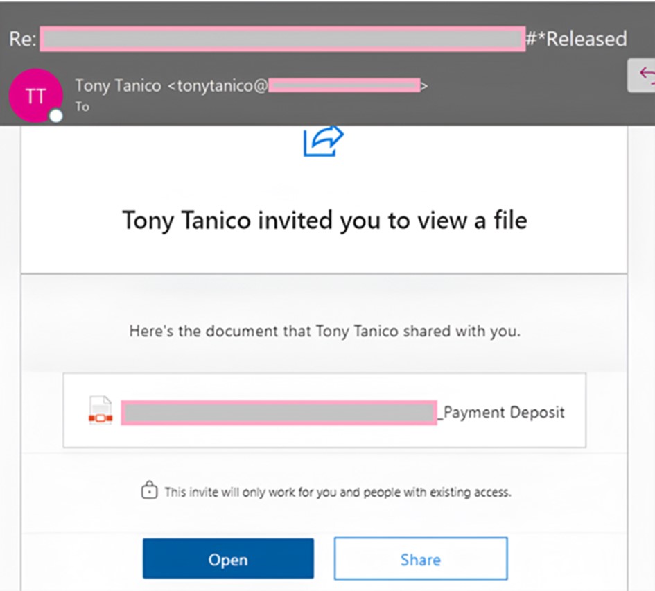 Analitycy odkryli fałszywe powiadomienia o udostępnieniu plików, które były hostowane na stronie i zawarte w e-mailach, mających na celu przekierowanie ofiar na fałszywą stronę.