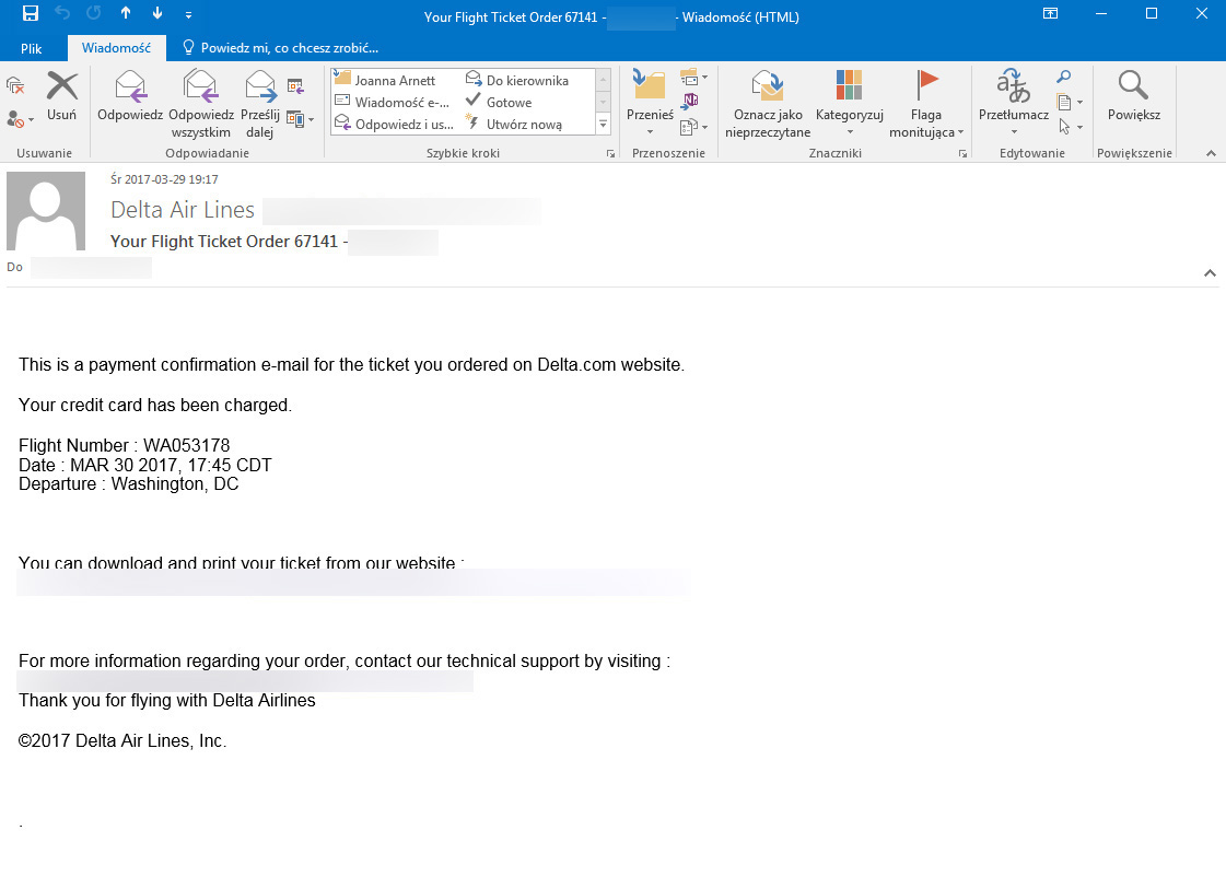 Otrzymałeś maila potwierdzającego zakup biletu lotniczego do Waszyngtonu? Pewnie nie kupowałeś biletu do USA, ale powstrzymaj swoją ciekawość i nie otwieraj załącznika. To może być pułapka! Eksperci z firmy ESET przechwycili wiadomości mailowe, w których cyberprzestępcy podszywają się pod amerykańskie linie lotnicze Delta Air Lines. Celem pułapki jest kradzież danych logowania, zapisanych w przeglądarkach internetowych i aplikacjach poczty elektronicznej.