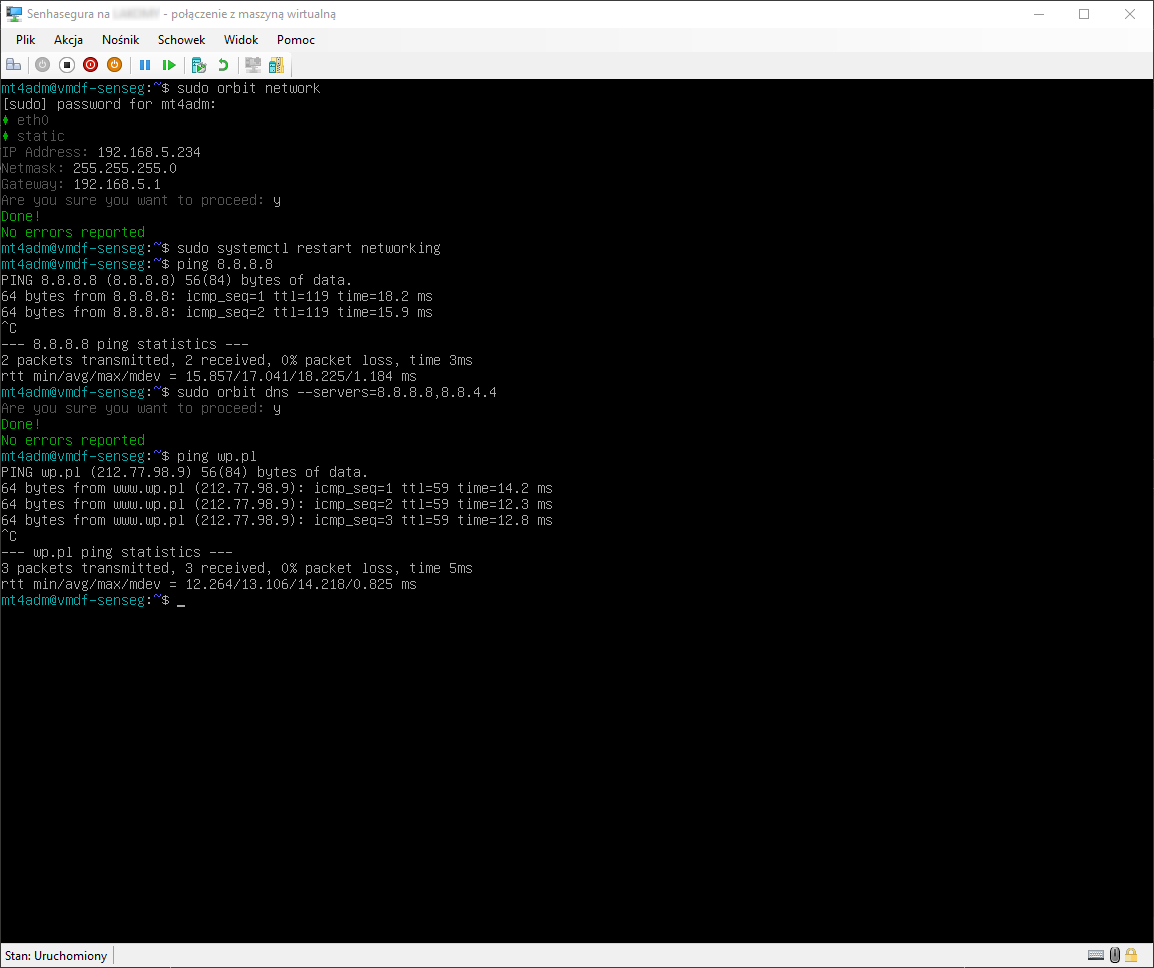 - Sprawdzamy, czy konfiguracja, którą wprowadziliśmy jest poprawna $ ping 8.8.8.8.