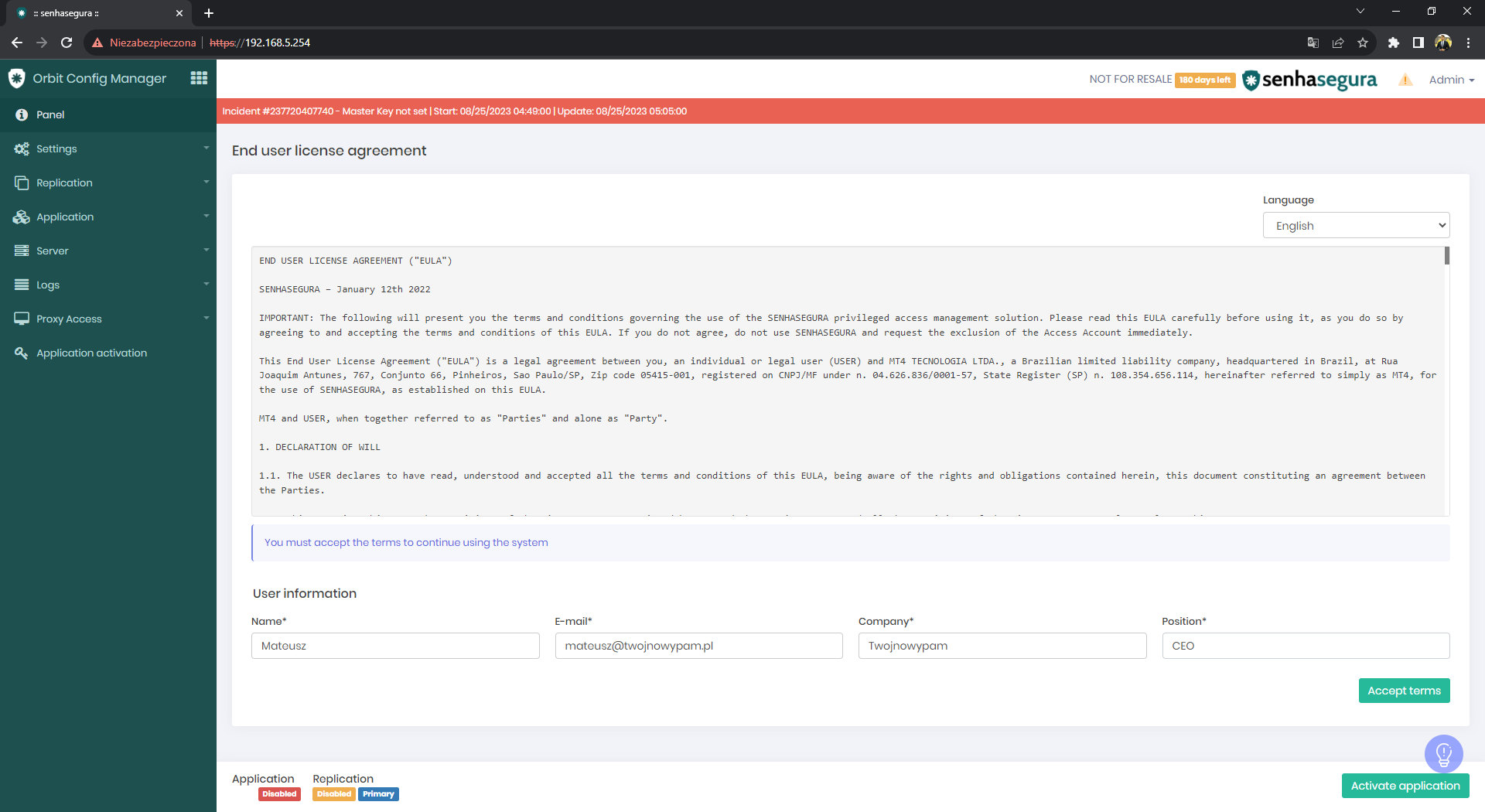 - Powinniśmy otrzymać taki widok, gdzie uzupełniamy poniższe dane, po czym klikamy “ACCEPT TERMS” i zostajemy przeniesieni do kolejnego okna konfiguracyjnego: