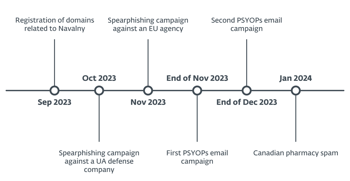 Ponadto w październiku 2023 r. ESET wykrył ukierunkowaną kampanię phishingową, której celem była ukraińska firma z branży obronnej, a w listopadzie 2023 kampanię skierowaną do agencji UE, wykorzystującą sfabrykowane strony logowania Microsoft. Celem tych działań była kradzież danych uwierzytelniających do kont Microsoft Office 365. Zdaniem analityków ESET, ze względu na podobieństwa w infrastrukturze sieciowej wykorzystywanej we wszystkich tych działaniach, można założyć, że były one powiązane.