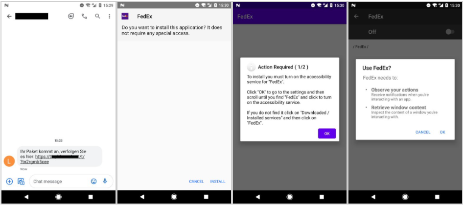 Ofiara najpierw otrzymuje wiadomość SMS od nadawcy, który podszywa się pod popularną markę, zajmującą się przewozem przesyłek i logistyką, taką jak FedEx, DHL, UPS. Hakerzy wykorzystują też marki lokalnych usługodawców (np. InPost w Polsce czy Correos w Hiszpanii). Wiadomość nakłania użytkownika Androida do kliknięcia łącza w celu pobrania i zainstalowania aplikacji, w której nazwie również pojawia się marka przewoźnika. W rzeczywistości to złośliwe oprogramowanie FluBot. Wiadomości SMS mają różną treść, np. „Twoja paczka jest w drodze, śledź ją tutaj (tu link)” lub „Nie byliśmy w stanie dostarczyć Twojej paczki. Kliknij, aby utworzyć nową datę dostawy (tu link)”. Z kolei mutacja kampanii wymierzona w posiadaczy telefonów z systemem iOS zawiera ankietę, która wyłudza dane, wyświetla fałszywą informację o wygranej i zachęca do opłacenia przesyłki z nagrodą.